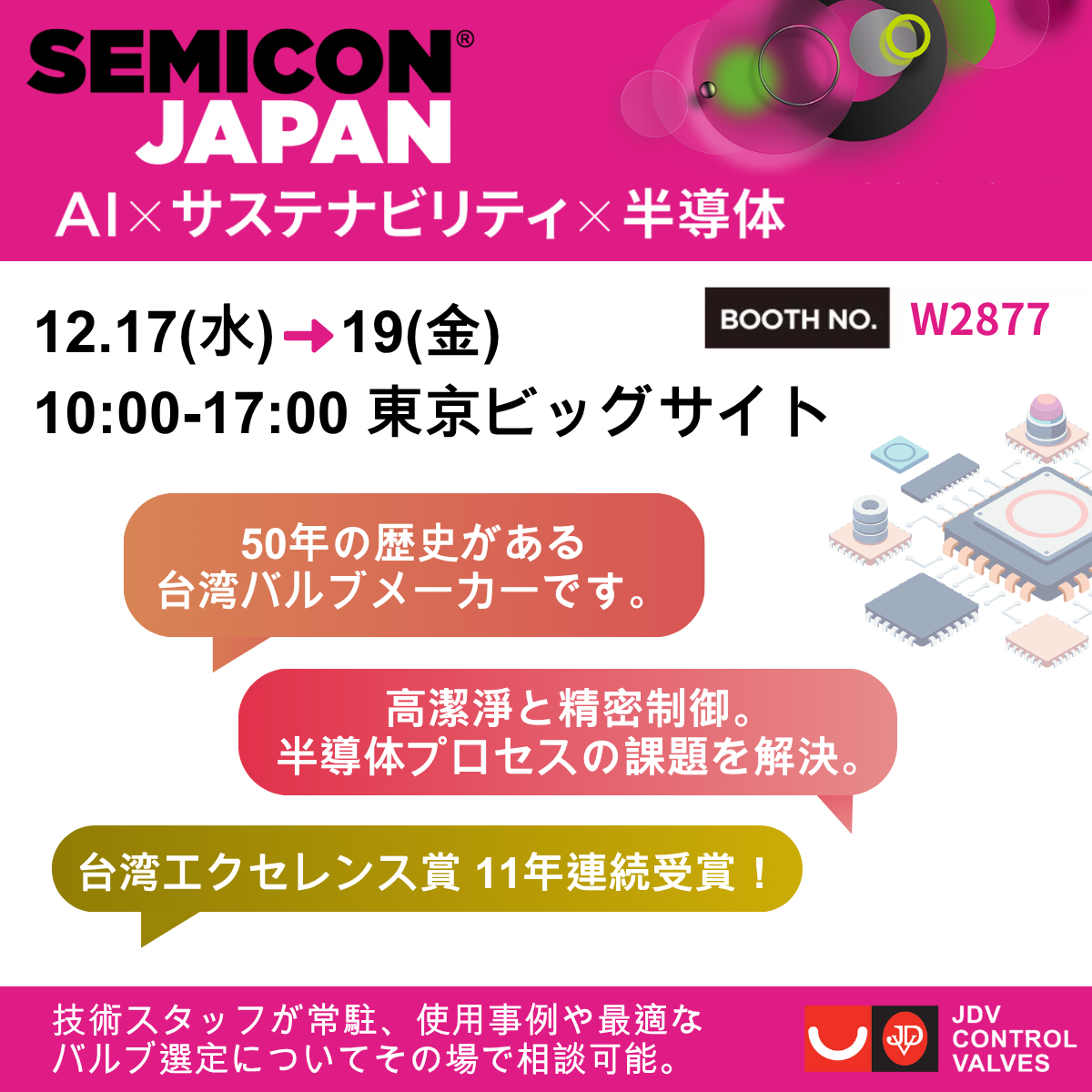 全球高階控制閥領導製造商進典工業將參加於2025年12月17日至19日 在 Tokyo Big Sight 盛大舉行的 Semicon Japan 2025 展覽。